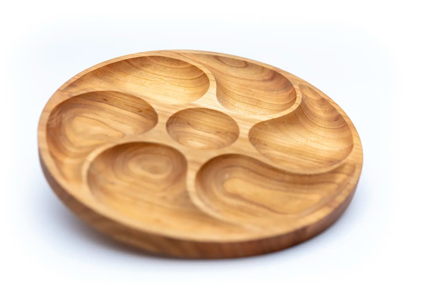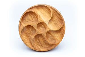 Der Manji Snackteller wird aus massiver Esche handgefertigt. Die sieben unterschiedlich großen Mulden sind perfekt zum Servieren von Nüssen, Obst, Dips oder kleinen Leckereien. Die glatte Rückseite lässt sich vielseitig als Schneide- oder Servierbrett einsetzen. Die Oberfläche ist pflegeleicht, geölt und antibakteriell.