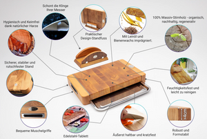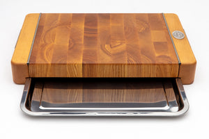 Bestelle dein Premium Stirnholz-Schneidebrett Modell 21 mit ausziehbarem Edelstahltablett und erlebe den Unterschied, den Qualität, Individualität und Design ausmachen können.