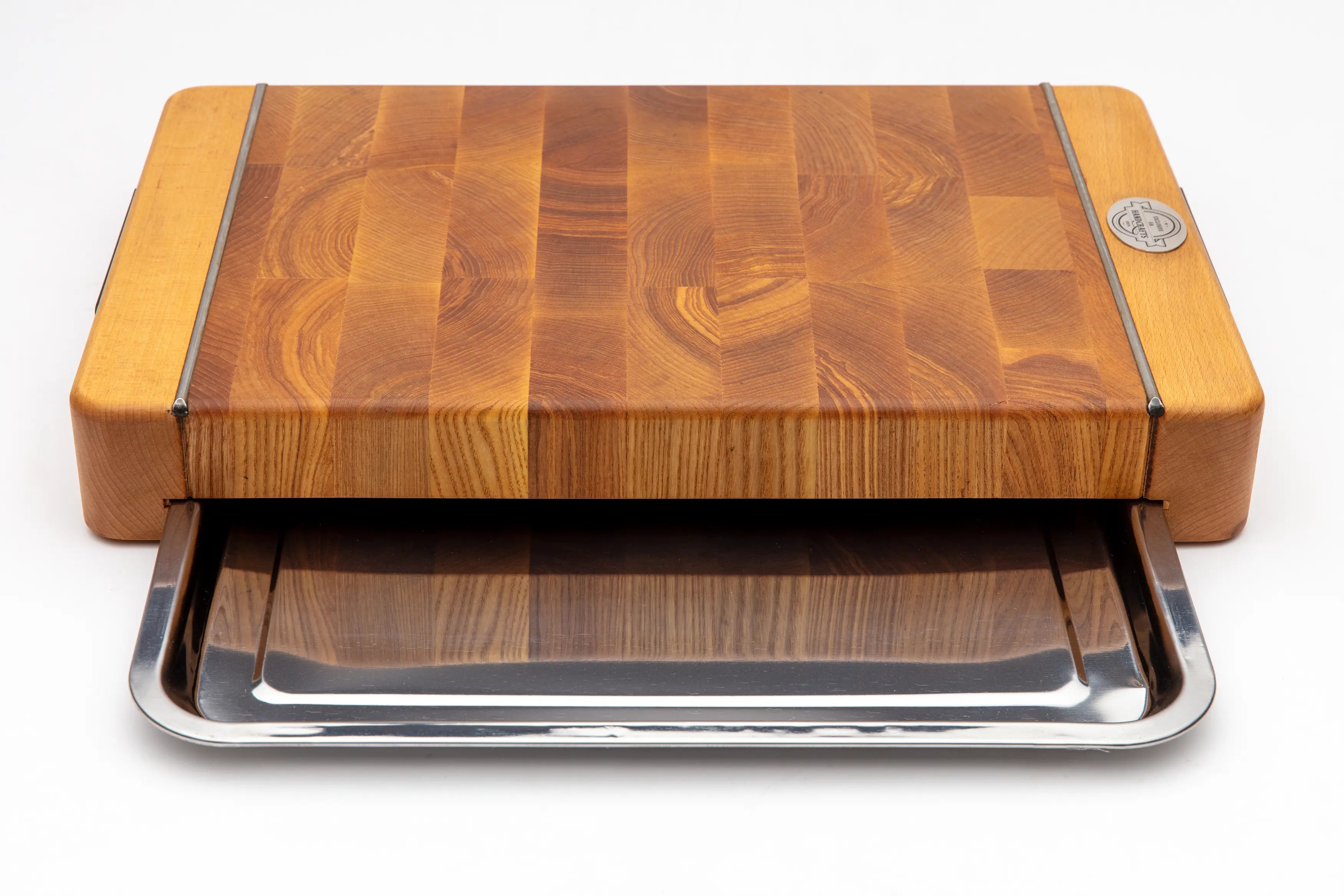 Die Modellreihe 21 unserer Premium Stirnholz-Schneidebretter mit ausziehbarem Edelstahltablett ist mehr als nur ein Küchenutensil – sie ist ein Kunstwerk, das modernes Design und höchste Handwerkskunst vereint. Diese Schneidebretter bringen Eleganz und Stil in jede Küche, egal ob rustikal oder modern.