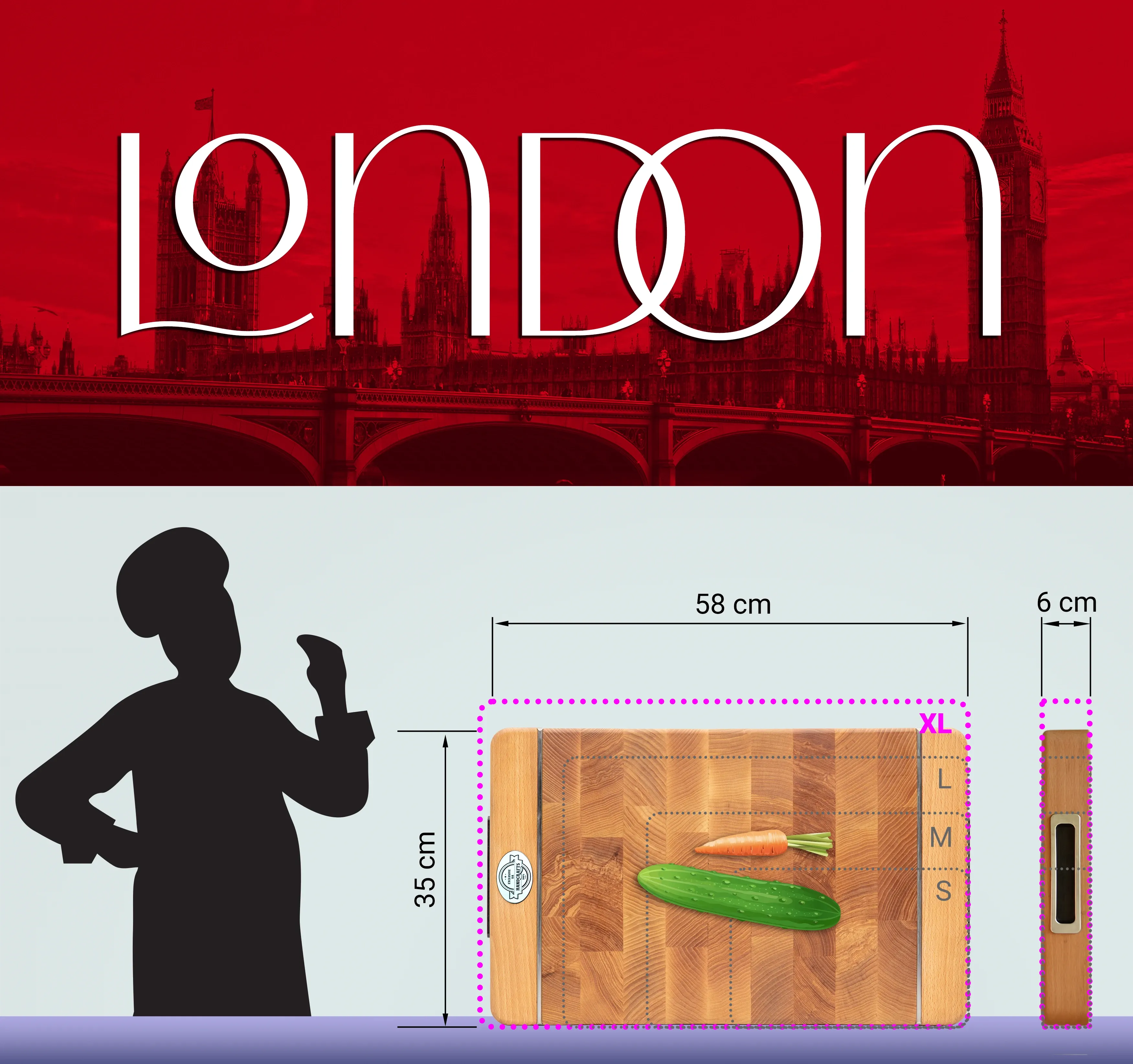 - London (57x35x6 cm): Großes Schneidebrett, das sowohl für umfangreiche Mahlzeiten als auch für stilvolle Präsentationen geeignet ist.