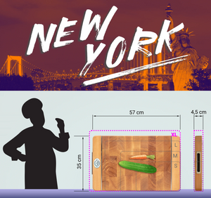 - New York (57x35x5 cm): Großes Schneidebrett, das sowohl für umfangreiche Mahlzeiten als auch für stilvolle Präsentationen geeignet ist.