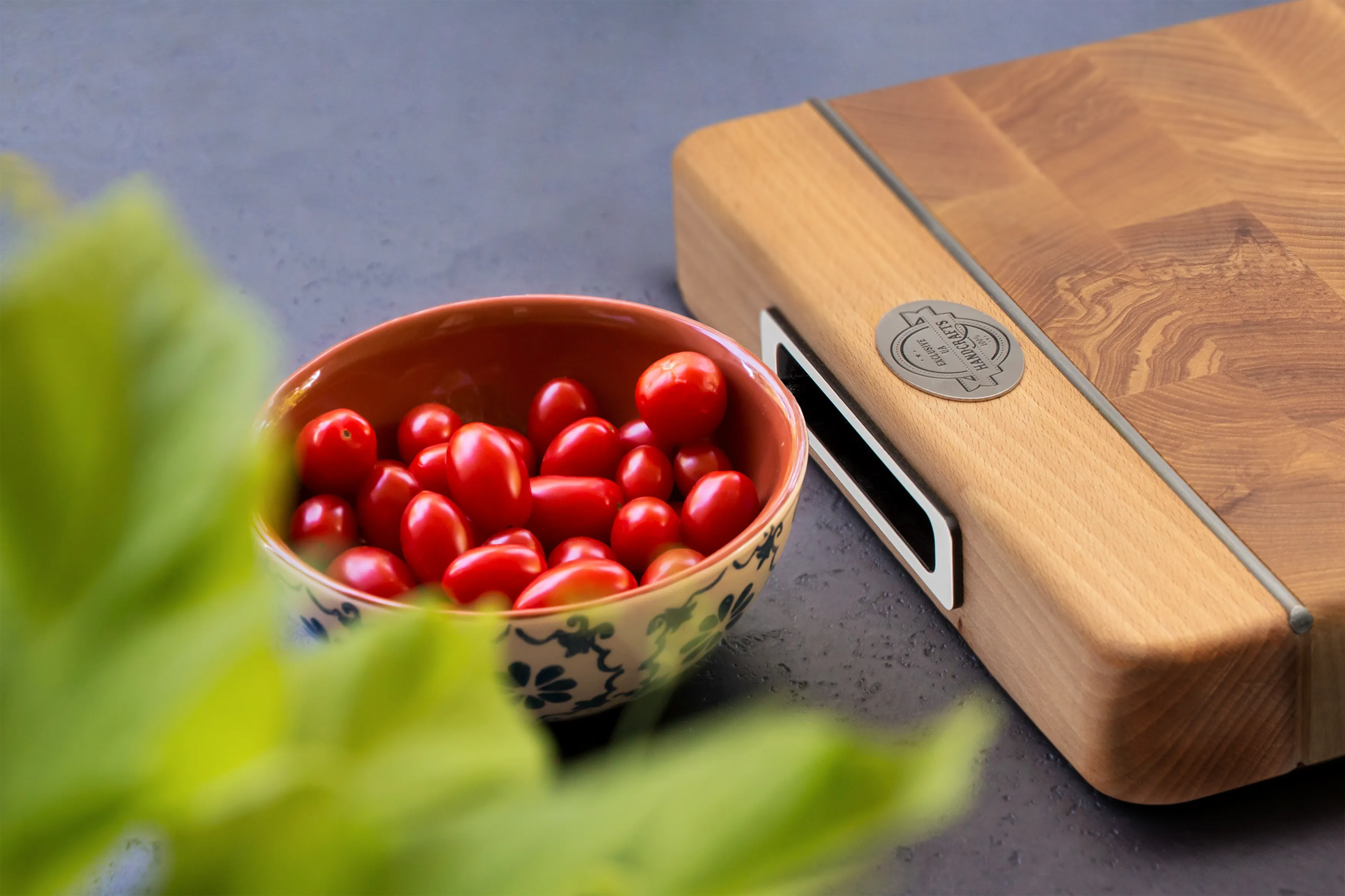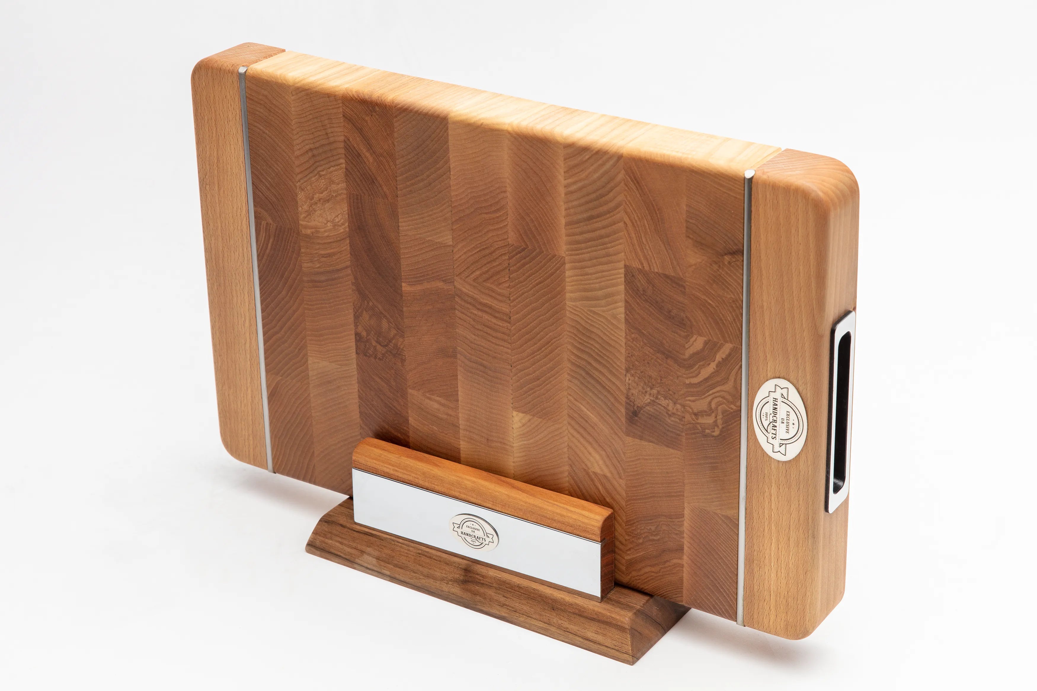 Die Premium Stirnholz-Schneidebretter der Modellreihe 22 kombinieren modernes Design und hohe Funktionalität. Diese Bretter sind die perfekte Wahl für alle, die klare Linien und aufgeräumte Ästhetik schätzen. Durch innovative Designelemente, wie den geradlinigen Standfuß mit großen Chromflächen, setzen sie neue Maßstäbe in Sachen Eleganz und Praktikabilität.