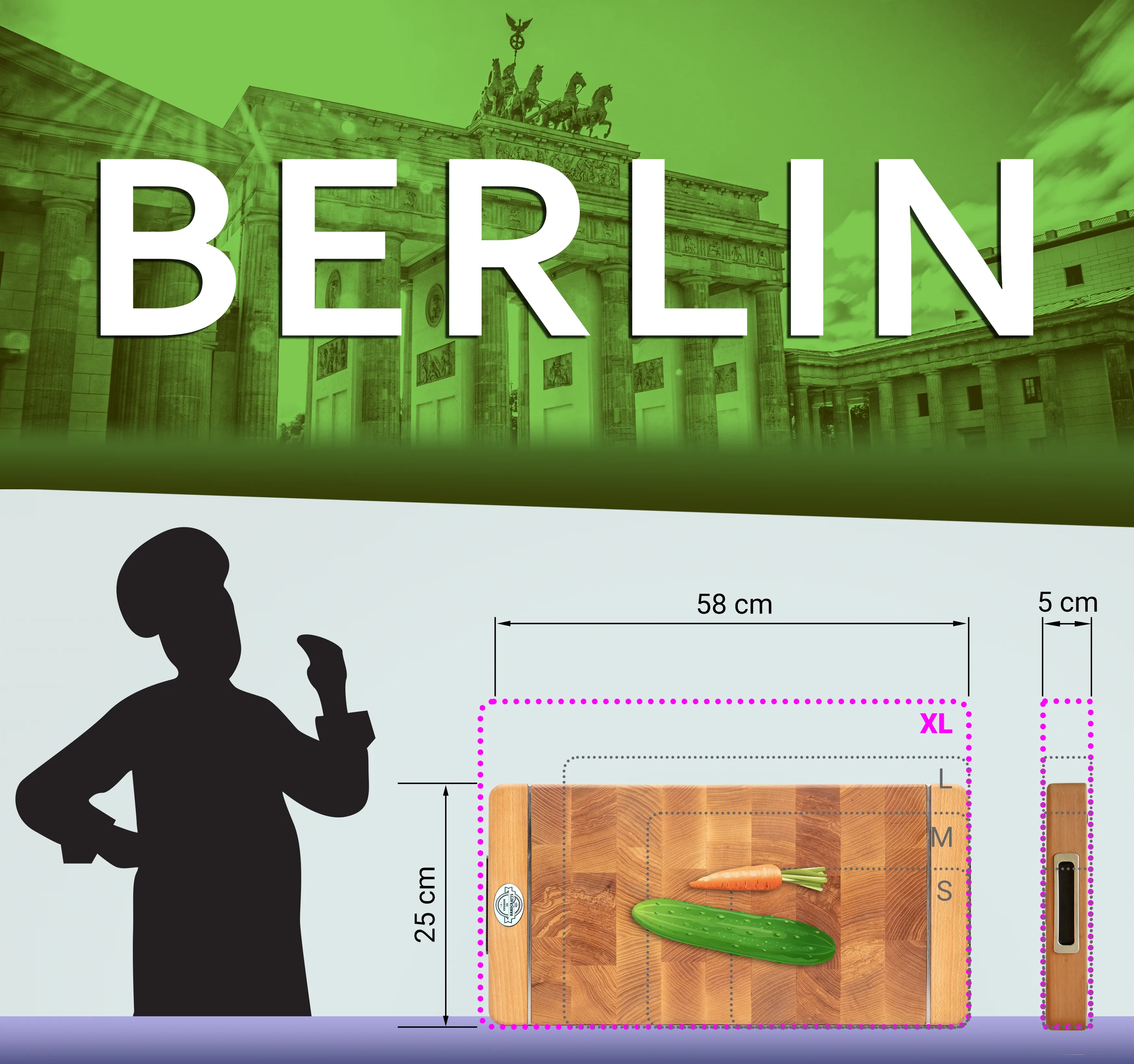 - Berlin (58x28x5 cm): Besonders langes Format, ideal für die Zubereitung von längeren Lebensmitteln wie Fisch, Fleisch oder Brot.