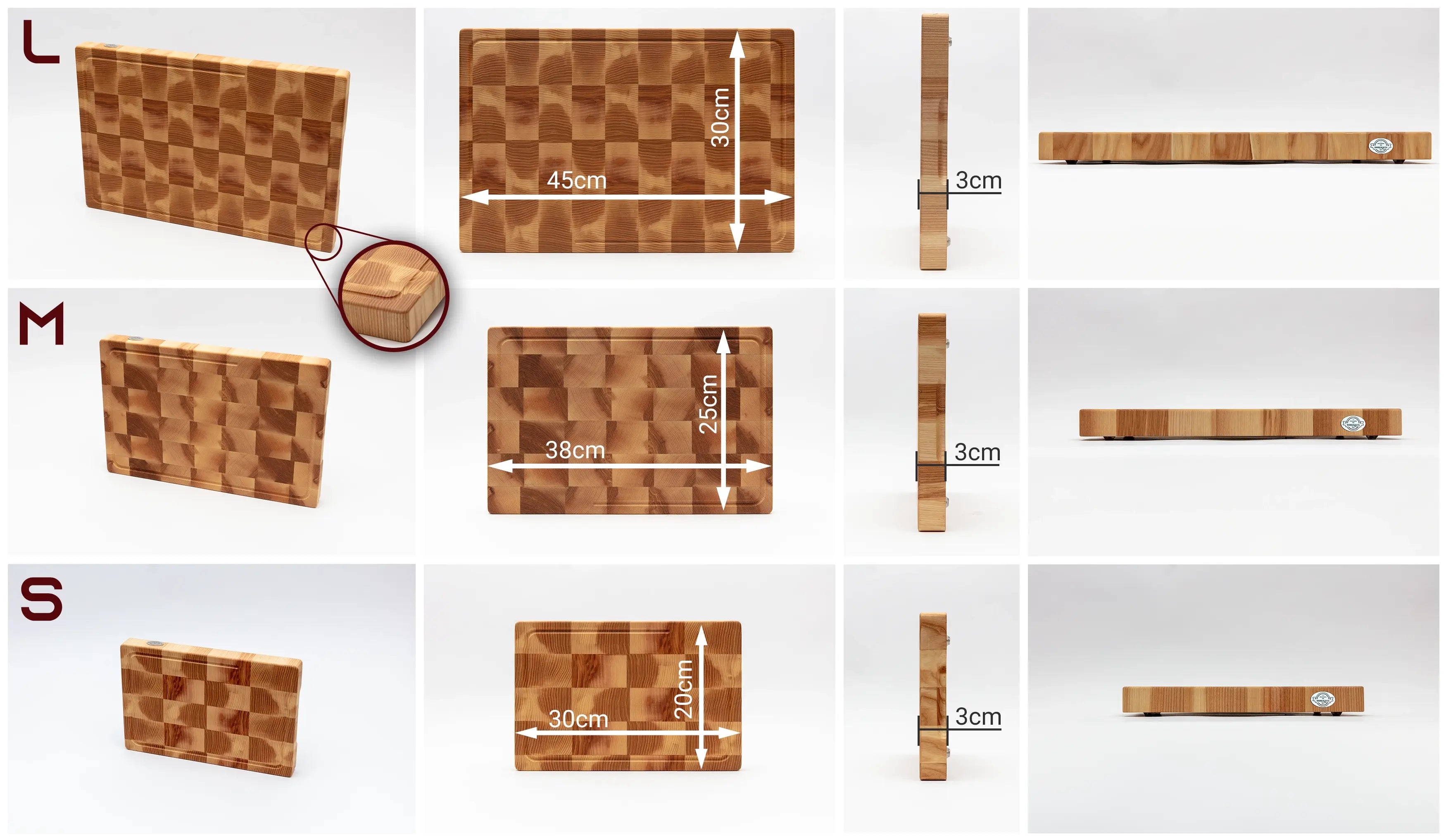 - Größe S (30x20x3 cm): Kompakte Größe, ideal für kleinere Küchen oder als Schneidebrett für den schnellen Einsatz.