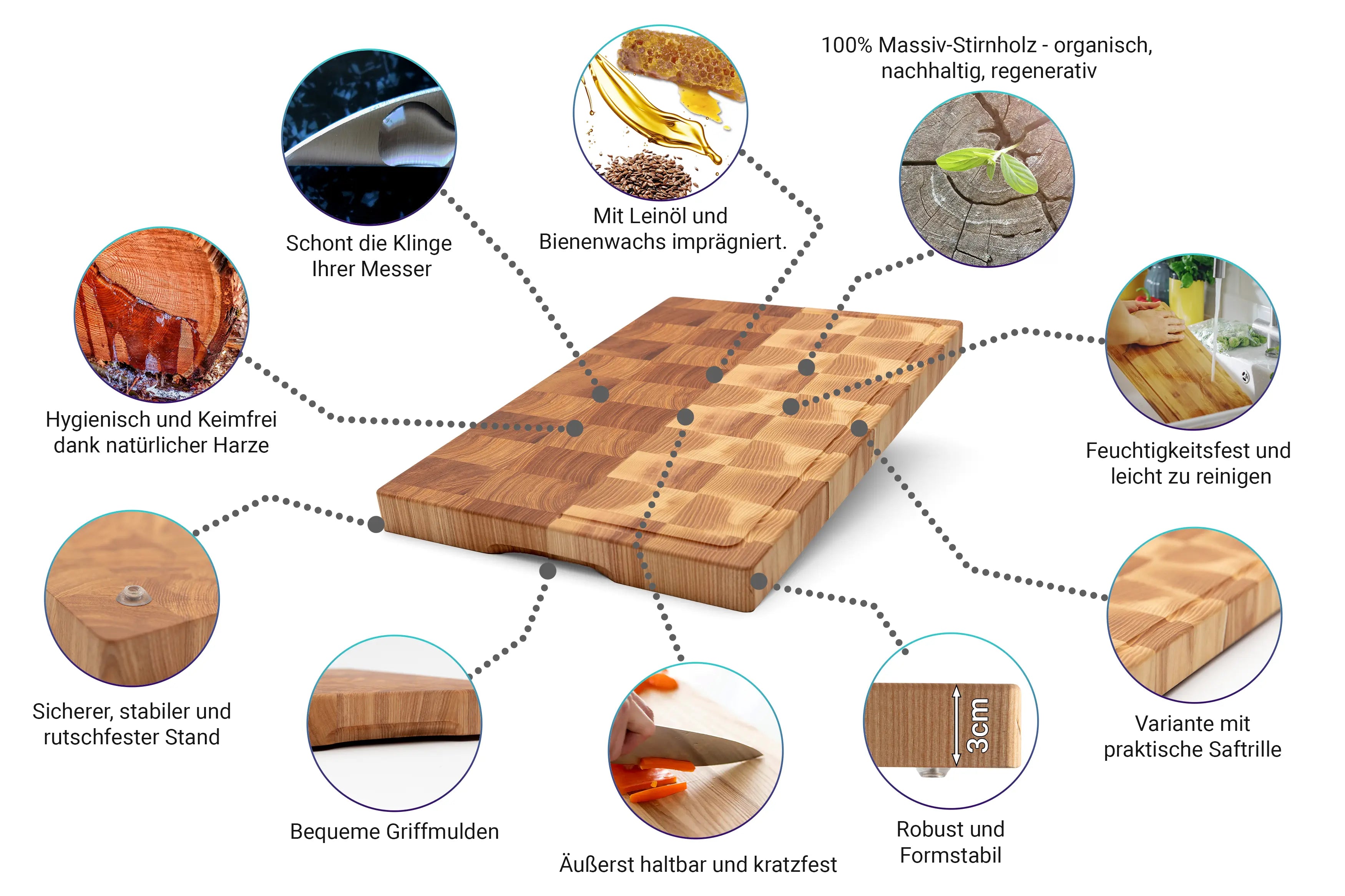 - Hygienisch und pflegeleicht: Imprägniert mit einem speziellen Leinöl-Bienenwachs Gemisch aus eigener Herstellung, das das Holz schützt und pflegt.